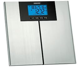 The beautiful stainless steel body composition scanner bath scale with KnowledgeBook technology measures body fat, body water, muscle, bone mass and daily CaloriePredicator. Great for the entire family shows 12 user memories, heath status indicator, normal and athlete mode. Easy to read 2.0" LCD display with blue backlight. 400 lb/180 kg capacity.
